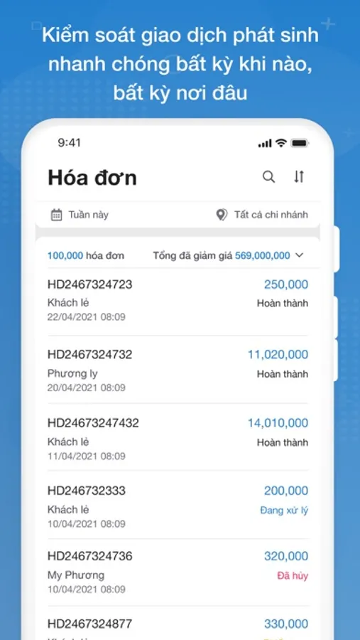 Giúp bạn nắm bắt chính xác, đầy đủ tình trạng giao dịch của từng đơn hàng, tại từng chi nhánh theo thời gian thực (cập nhật ngay khi giao dịch diễn ra). Giảm thiểu các thất thoát do nhầm lẫn, gian lận.