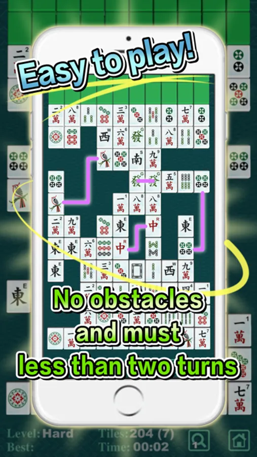 Tap two identical tiles can be paired and removed if the tiles haven't any obstacles between them and removing route must less than two turns.