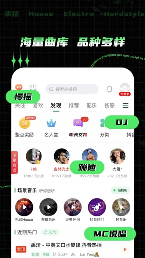 超多的无损免费音乐曲库,节奏感爆棚、嗨翻全场的火爆DJ电音舞曲应有尽有,还有许多DJ电音创作者和DJ电音爱好者聚集在这里~让我们一起跳起来吧!管他白天还是黑夜!