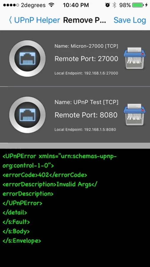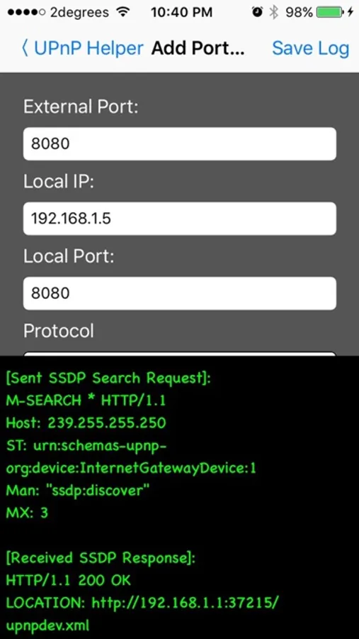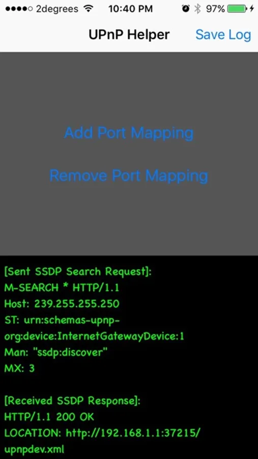 - "Save Log", archives the SSDP and SOAP communication data via email or air drop for further investigation.