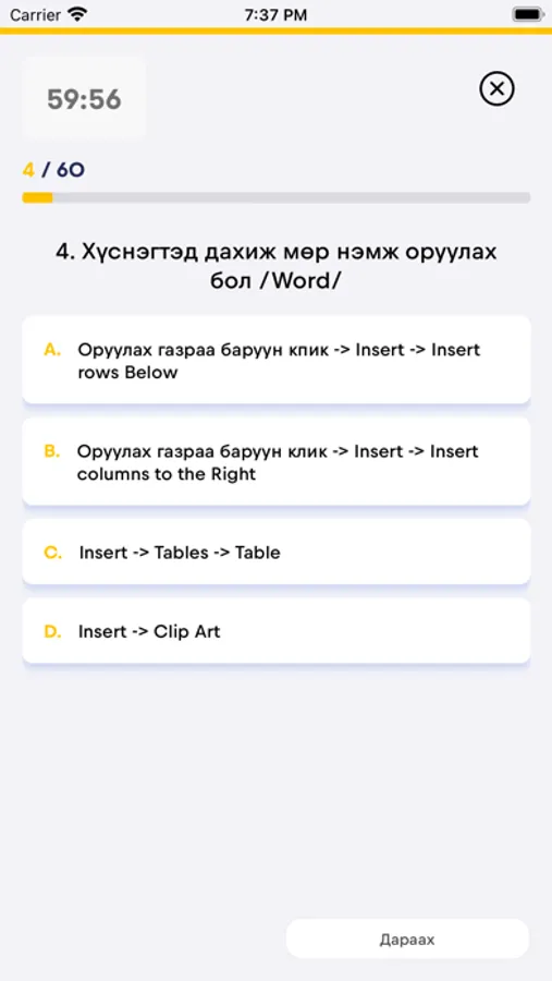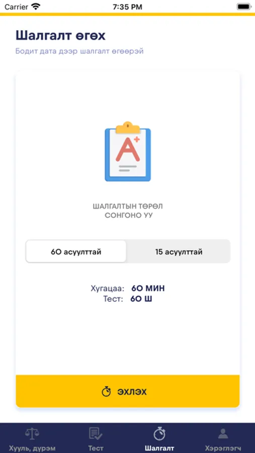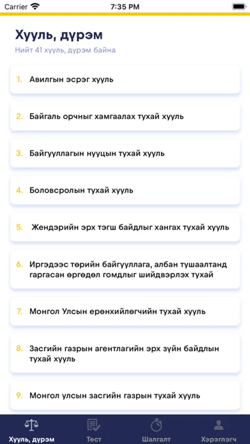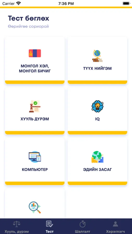 Одоогоор (2018 оны шинэчлэлт орсон) 44н хуулийн бүлэг уншихаар, Монгол хэл, Нийгэм Түүх, Хууль дүрэм, iQ, Компьютер, Албан хэрэг хөтлөлт гэсэн 6н төрлийн 3500 тестийн сантай, шалгалтын зарыг харах боломжтойгоос гадна таны алдсан тестийг эргэн таньд сануулах чадвартай.