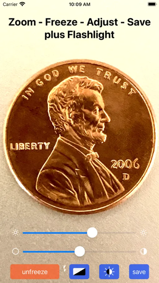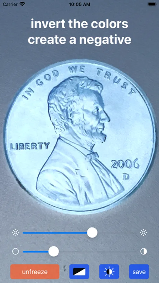 You can switch to the front camera and use as a mirror with light bars for dim lighting. A simple tap on the screen freezes the image for a closer look and some fine adjustments if you like. You can pinch to zoom, rotate, and pan the frozen image and also make adjustments to brightness and contrast. A save button lets you send the final image to your Photos. There is even a toggle button to invert the colors and create a negative image.