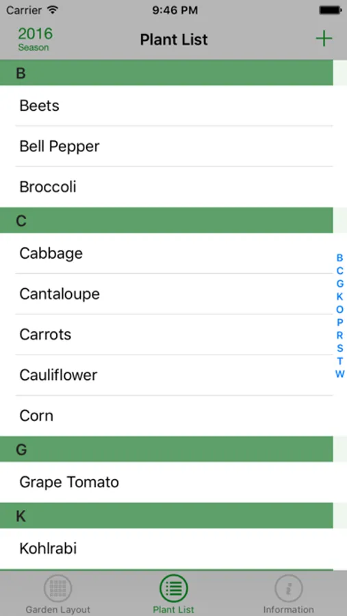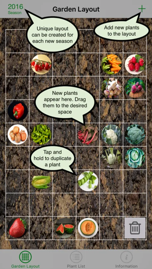 Garden Diary is a fun and easy way to track the progress of your garden year after year. Choose from over 60 icon images or use your own photos to represent each plant and arrange them in the grid to reflect the layout of your garden. Tap an icon to bring up the details for each plant. Track the current status of each plant and record the planting, sprouting, and harvesting dates. Germination and maturation times are automatically computed. Create a unique set of plants for each new season. Details for all past seasons are saved so you can see the progress year after year.