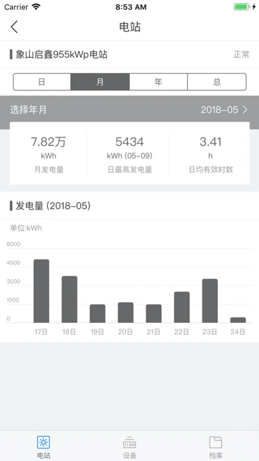 宁电新能源APP将用户历史发电量以日月 年总分类展示,让电站的发电状况有更加清晰的展示。