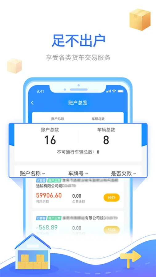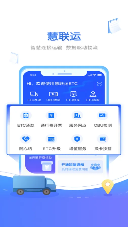 慧联运APP—货车人专属的APP,过高速95折,先通行后付费,交通卡充值、ETC还款、一键查账,简单快捷,支持徽通卡、苏通卡、八桂行卡、浙通卡、招商畅行卡办理。