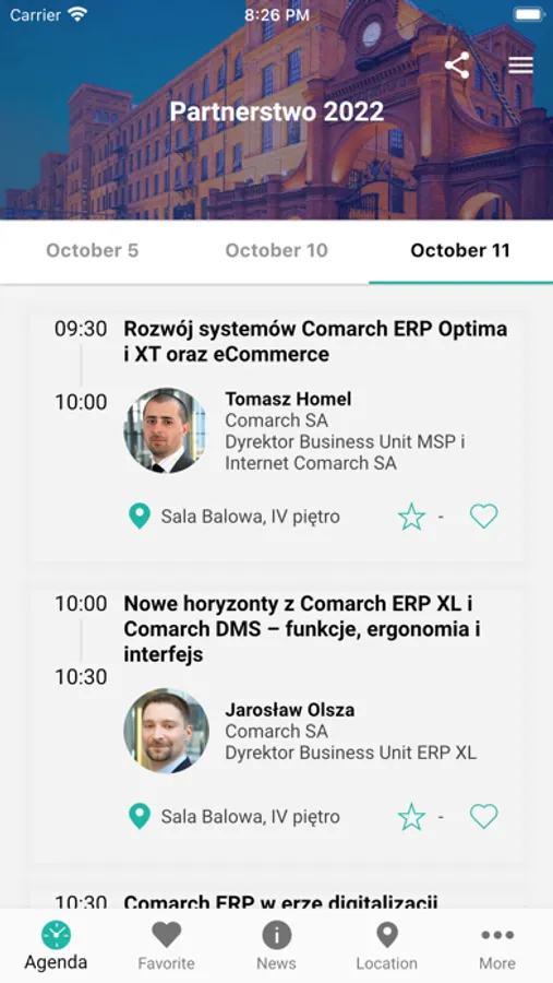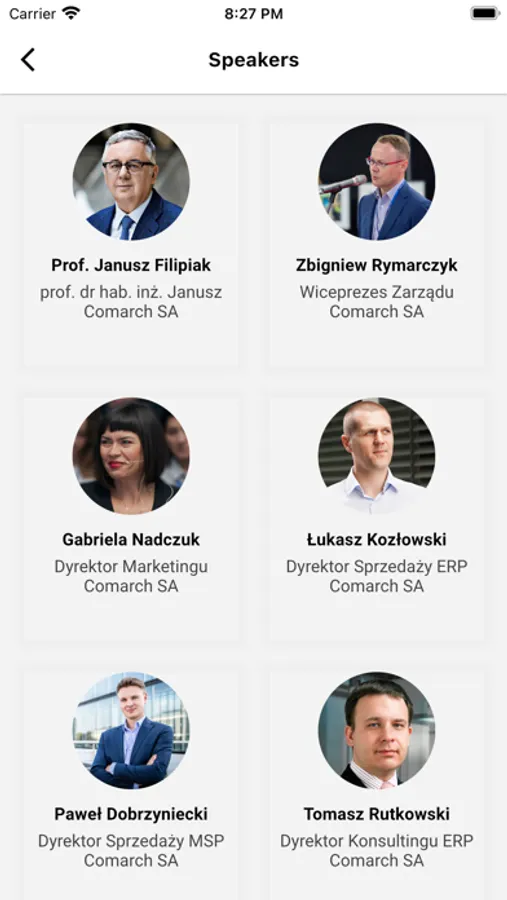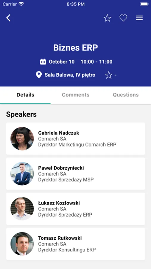 Comarch Events is an application for Comarch conference participants. It lets you find all the most important information about the event, and connects you with lecturers and other attendees. After logging in and selecting an event from the list, you get access to a wide range of tools - like the list of events and agenda, navigation to the conference, and the ability to interact with the speakers and network.