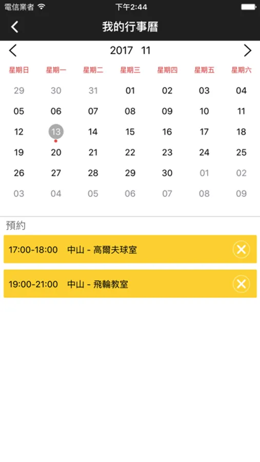 ● 運動行事曆:以行事曆方式顯示個人已預約場地/課程紀錄