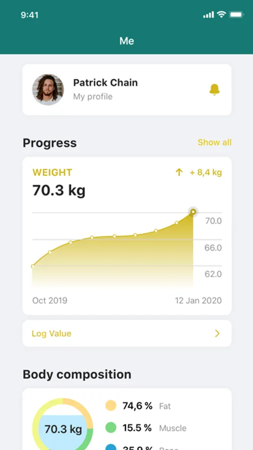 * Je gewicht en andere statistieken invoeren en je voortgang bijhouden