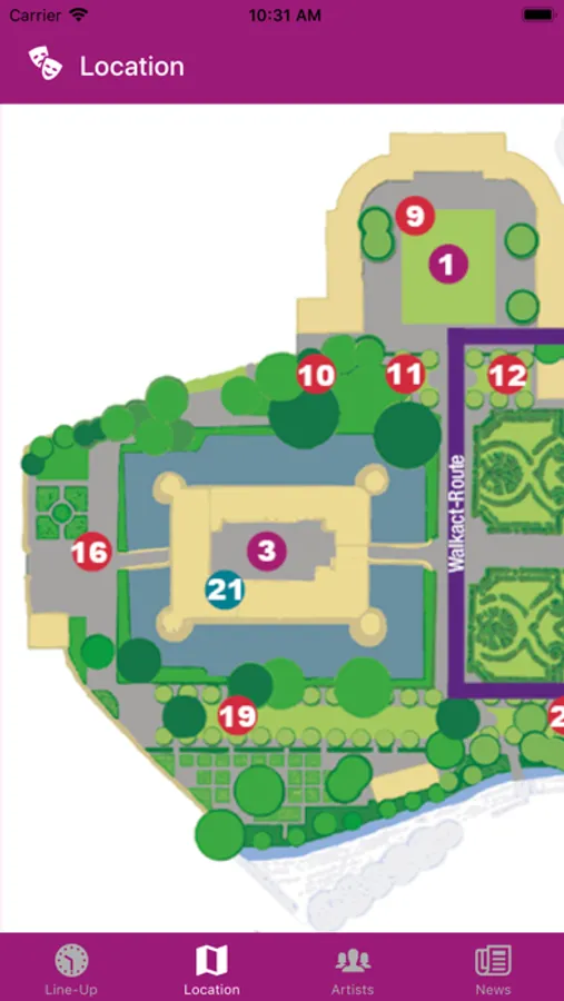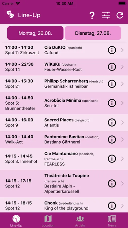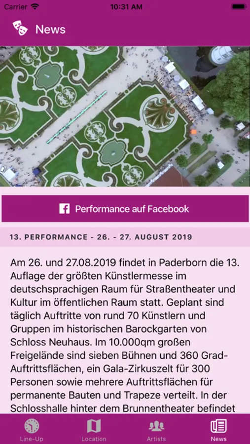 - Line-Up: Nach Auftrittsorten und Uhrzeit filterbar. Per GPS-Ortung bekommen Sie den Spielplan der Bühne in Ihrer Nähe angezeigt.
