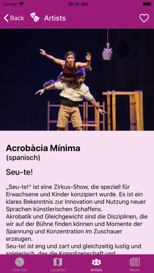 Neu 2019 ist die Favoriten-Funktion: Stellen Sie sich über die neue Filterfunktion Ihren persönlichen Show-Fahrplan zusammen. Wählen Sie die Künstler als Favoriten, die Sie sehen möchten und lassen Sie sich mit einem Klick Ihren individuellen Terminplan anzeigen.