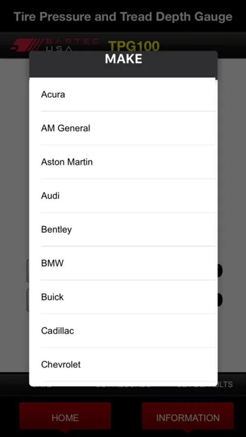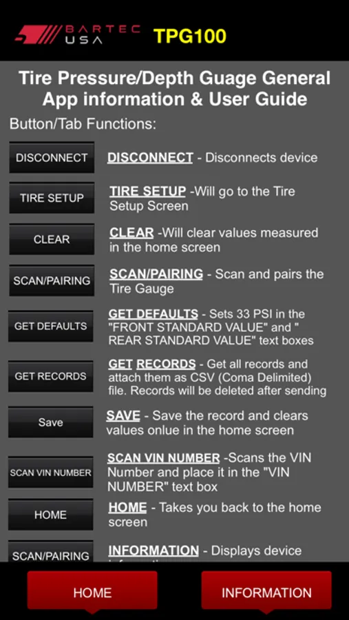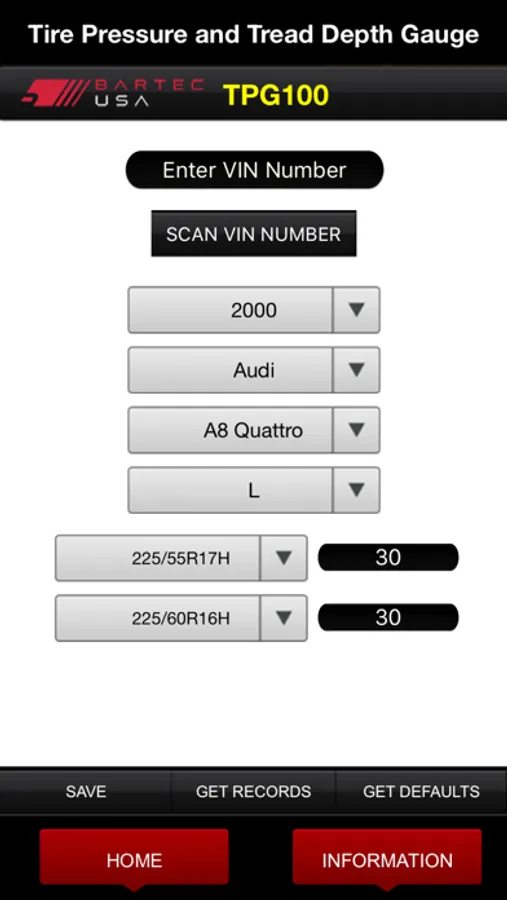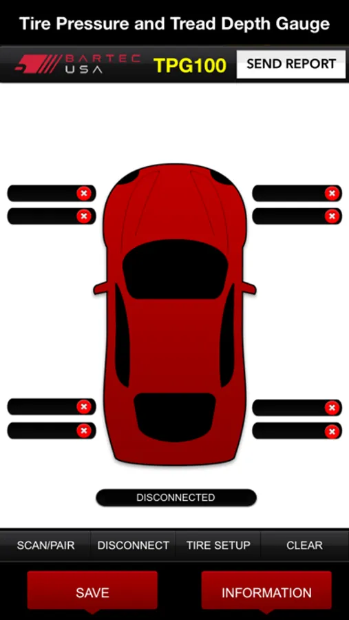 The BARTEC Bluetooth Tire Gauge scans the VIN number and finds the correct tire pressure of the vehicle. The BARTEC Bluetooth Tire gauge device is able of measuring and report tire pressure and tread depth of all four tires of the vehicle. Measurements are saved for later download via email.