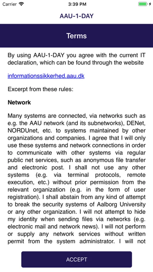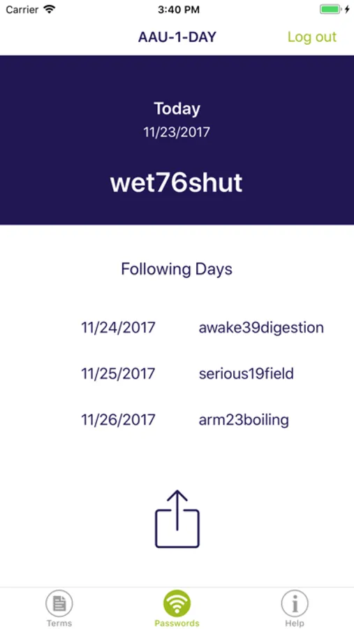Are you affiliated with AAU, and you need access to AAU-1-DAY. Then this app will provide you with the password for the current day along with the following three days passwords.