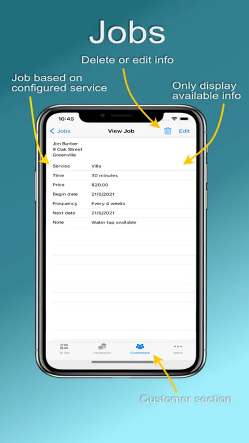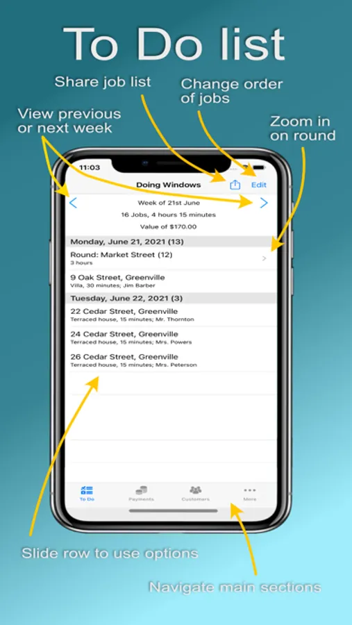 Keep details of all your customers. Plan the jobs you do for them, and set the job cycle. Organise the jobs with similar job cycle in rounds and set the round cycle to keep a consistent routine. Your weekly todo-list is generated automatically. Finished individual jobs are rescheduled according to their repeat cycle. Rounds are scheduled to their repeat cycle from their set date. Tick off job payments and finished jobs and keep track of the payments to receive.