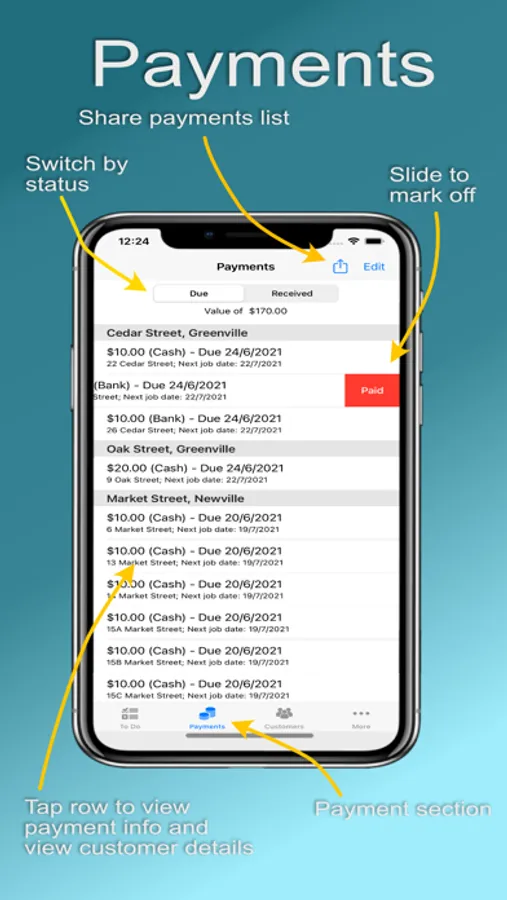 View and amend your payments to receive and received payments with totals grouped by day, week, or month. Register work related expenses. Register your vehicle mileage. Export lists with the Share function via compatible apps, such as those for email or texting, as well for opening in a spreadsheet app (like Numbers).