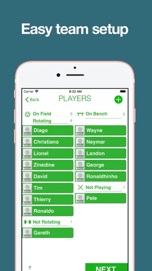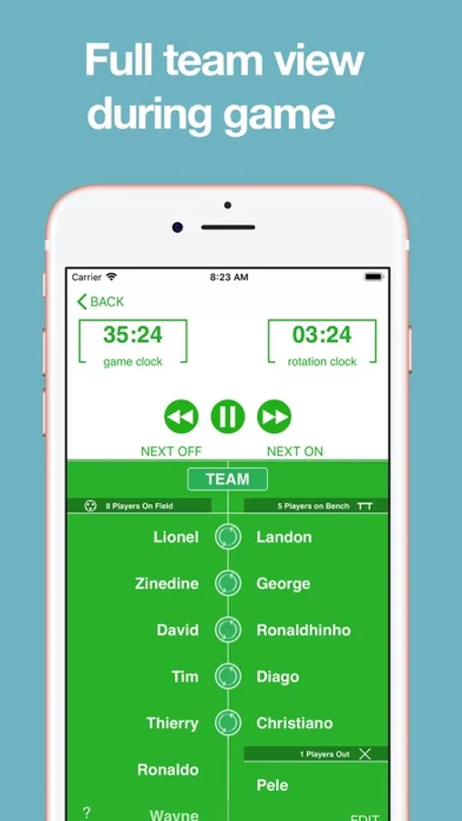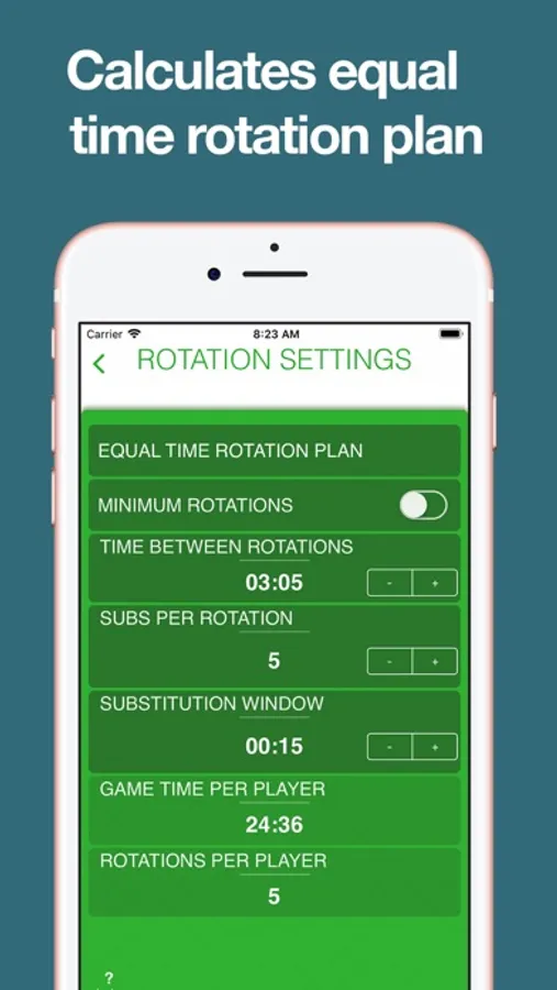Use the automatically calculated “Equal Game Time” rotation plan or set your own rotation period and number of subs per rotation.