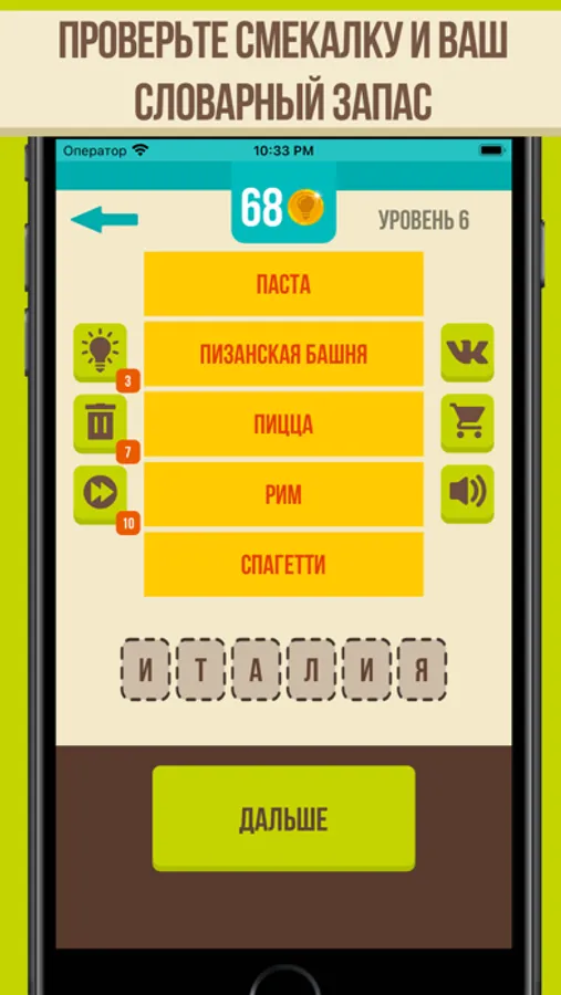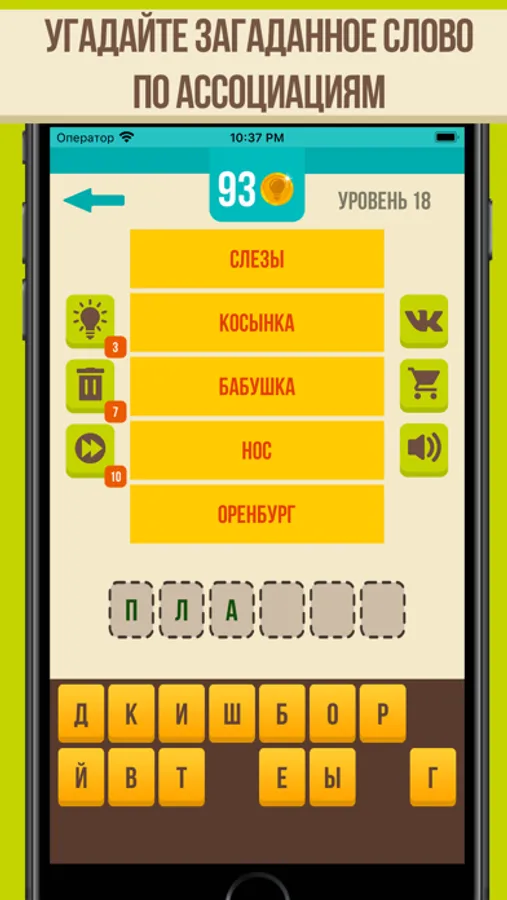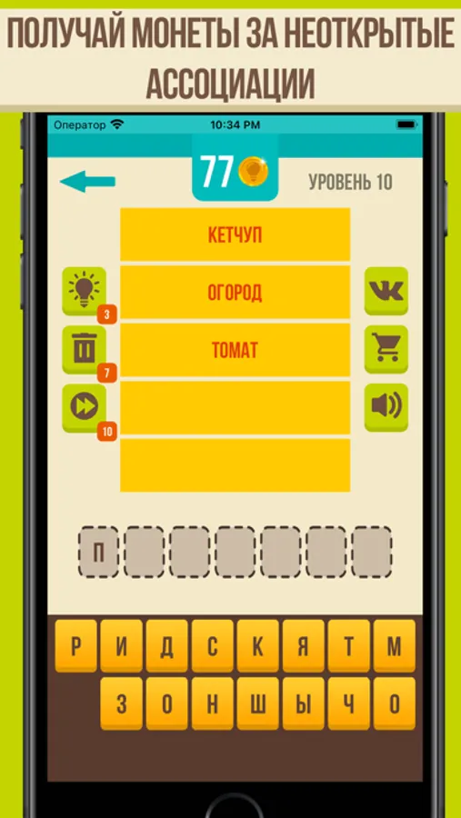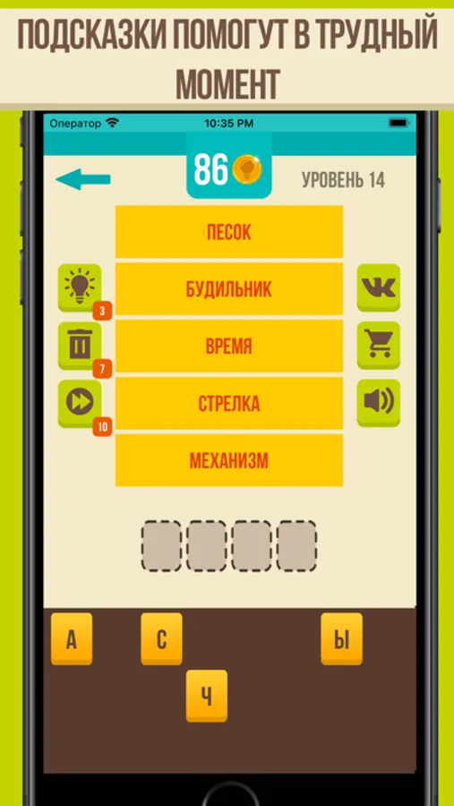 Монеты в словесной игре можно использовать для получения подсказок. Для упрощения игры есть три подсказки и возможность спросить у друзей VK.