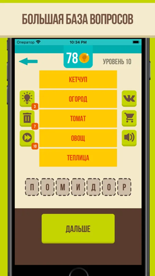 - 3 вида подсказок: открыть букву, удалить ненужные буквы и открыть слово;