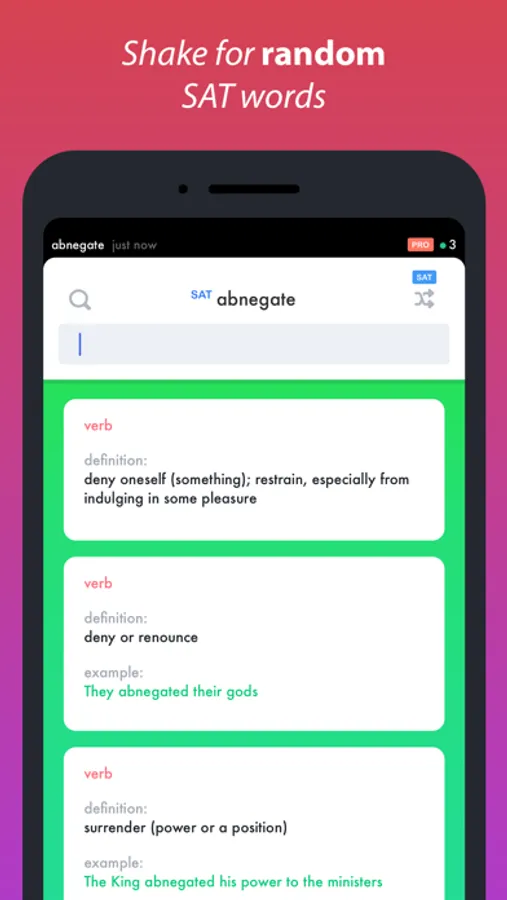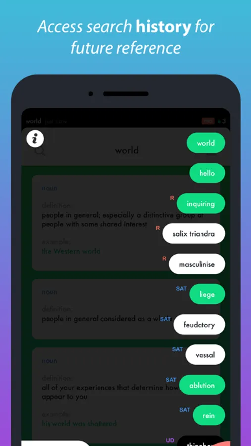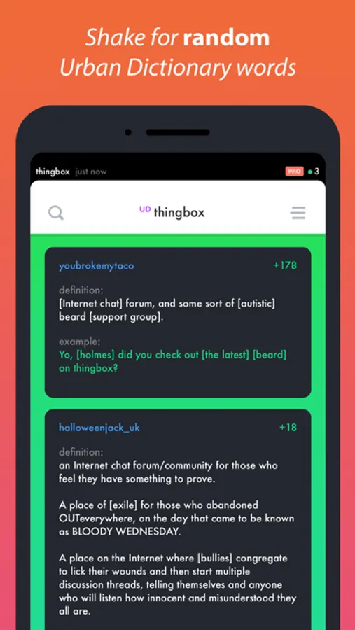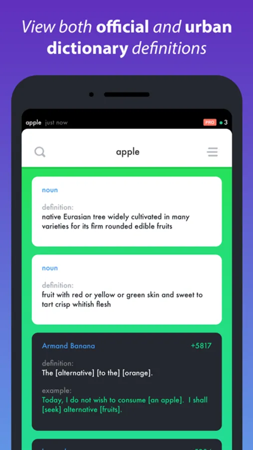 - Shows both the official definition and user generated definitions from Urban Dictionary are shown (if they exist) when a word is searched.