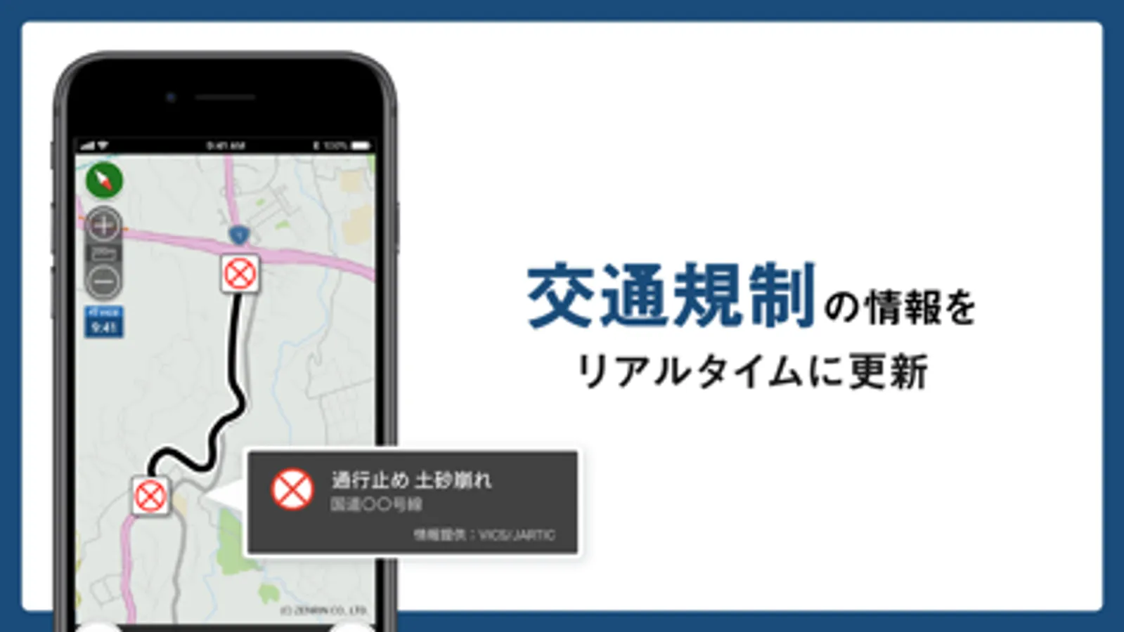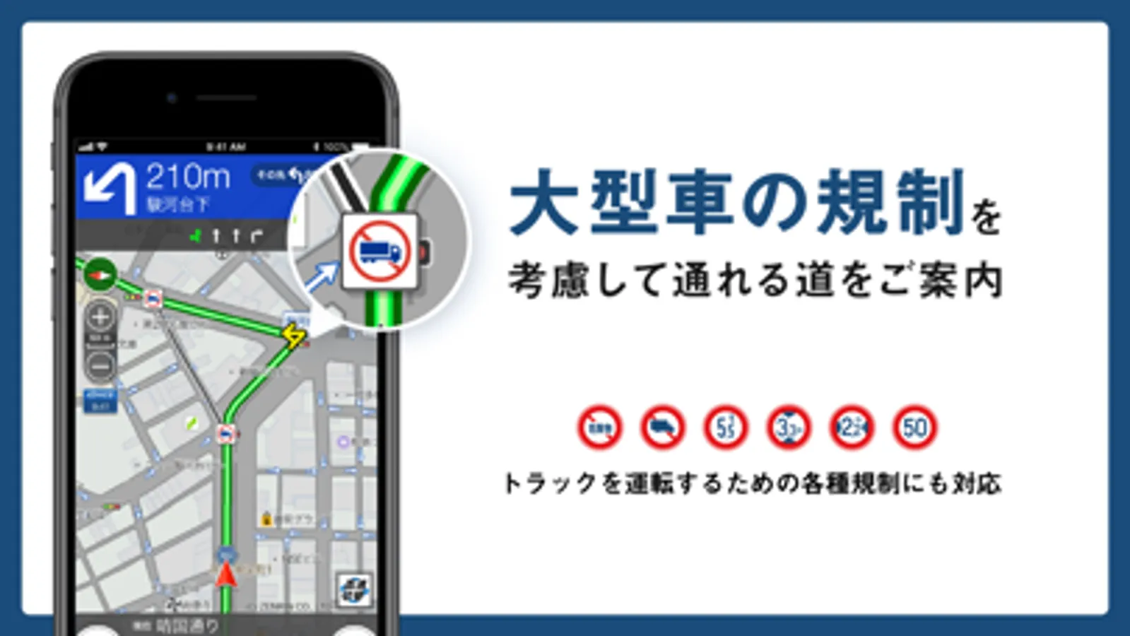 大型貨物車通行止めなどの各種車両規制区間を避けたルートを音声ナビゲーションします。