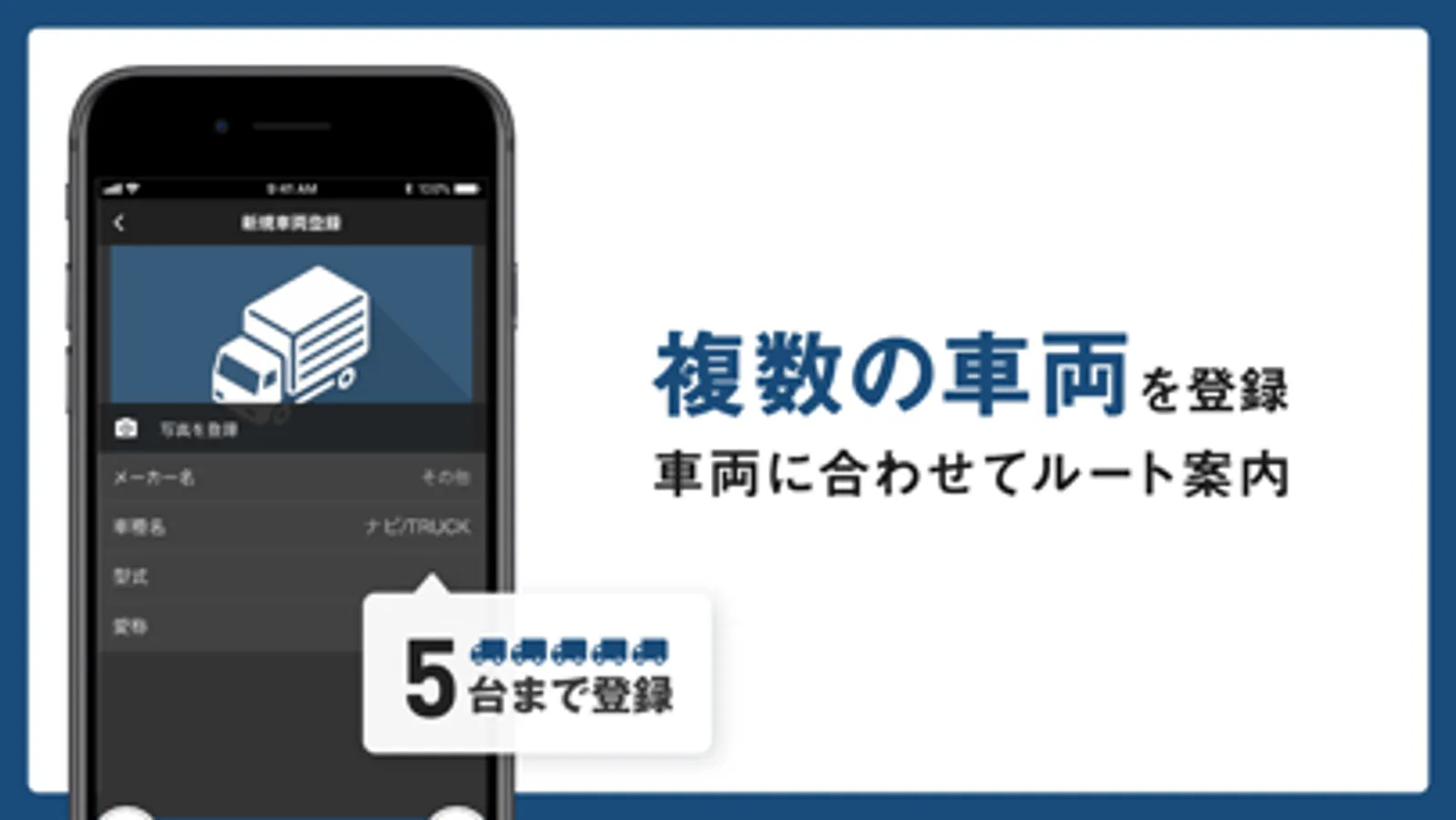 日本初のトラックドライバー向けに特化したカーナビアプリ。高精度な到着予想時刻、大型車特有の交通規制を考慮したルート検索、複数の訪問先を効率よく回る順序の提案、大型車が駐車可能な施設の検索などが特長です。
