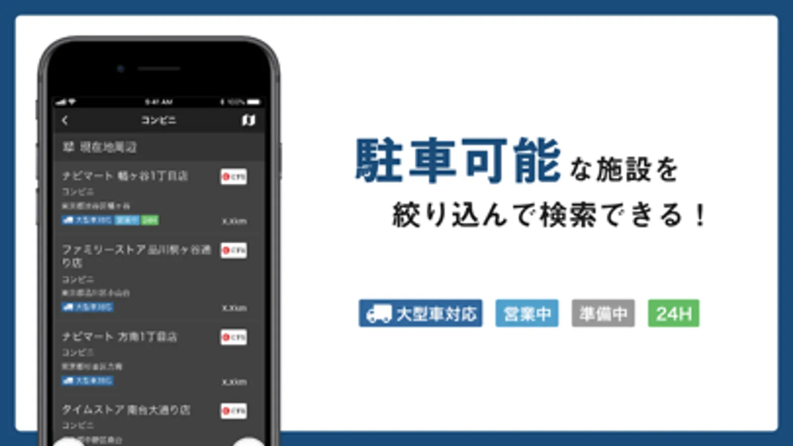 トラックが停車できるコンビニや道の駅、ホテルなどを絞り込んで休憩スポットを検索できます。