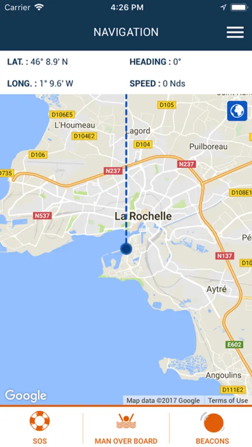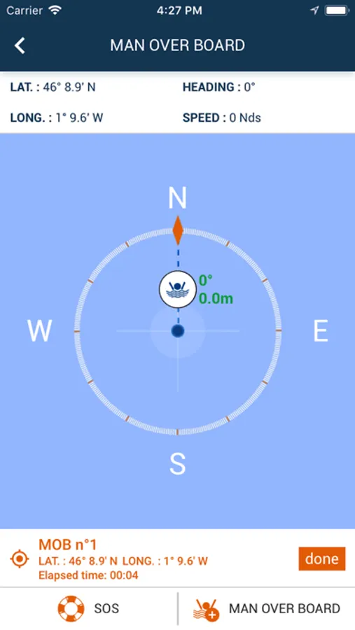 In case of a man over board, the app will automatically save its GPS location at the time of the incident. It will then display the bearing and distance to go back to the last known position of the MOB.