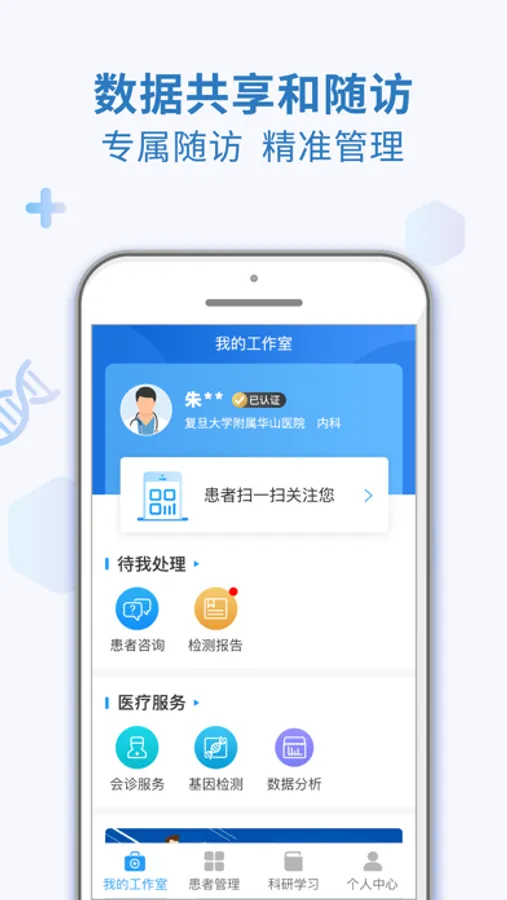 1. 数据共享和随访平台:电子报告在线查看、核心基因一键查询、患 者随访 & 管理、统计分析、靶向免疫药物查询、临床试验。