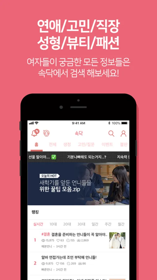 여자만을 위한 꿀정보 : 성고민, 연애, 패션, 뷰티, 성형, 취업, 학교, 펫, 덕질 등 여자들이 궁금해하는 모~든 정보가 있어요! 궁금한 정보들은 속닥에서 검색해보세요!