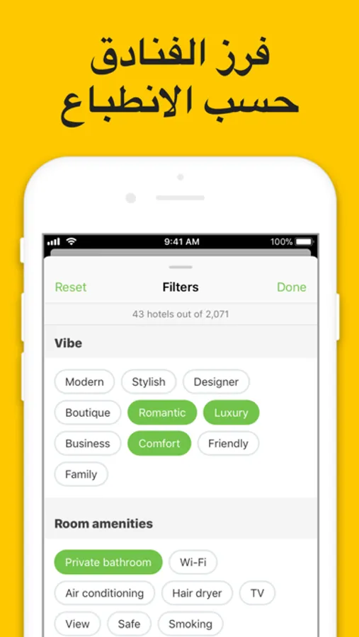 — خيارات الترتيب: ترتيب النتائج على حسب السعر، الشعبية، التقييم أو المسافة عن مركز المدينة.