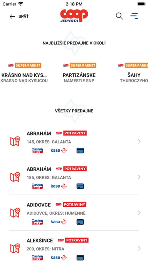 Abecedný zoznam všetkých predajní COOP Jednota Potraviny, Supermarket a Tempo