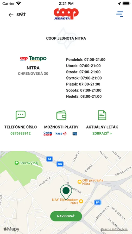 Informácie o otváracej dobe a možnostiach platby v každej predajni