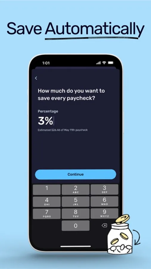- Save automatically – Choose a percentage you want to save and we’ll deduct it from your paycheck automatically.