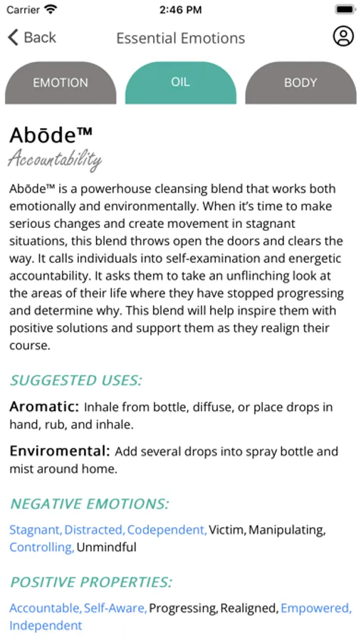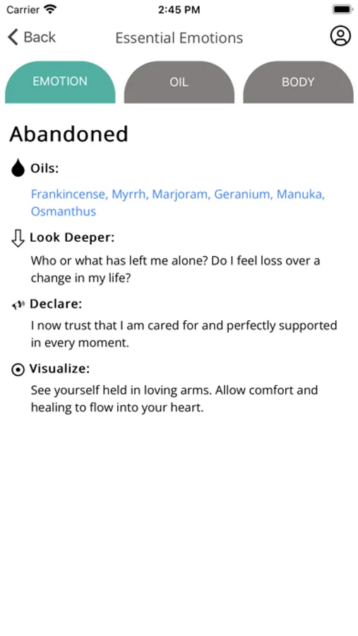 The Essential Emotions app lets you look up specific oils, emotions, or body concerns, then leads you through processing support to get to the root of your concern. Identify the negative emotion you are currently feeling or choose a positive one you want to feel from 500+ emotions, 100+ essential oils or 250+ body parts and systems. Apply the recommended essential oil, then reprogram thinking and behavior patterns by using questions to look deeper, declarations and visualization prompts.