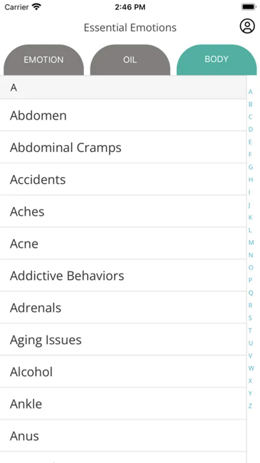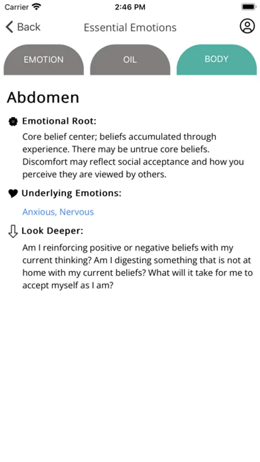 Body Tab with 250+ body parts and conditions that link to underlying emotional roots