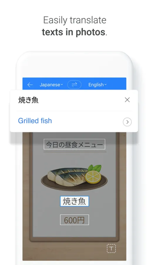 Automatic recognition and translation of text in the image by taking a picture and pressing the button