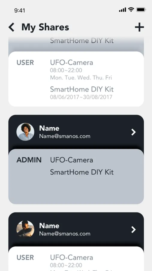 The app allows you to connect and share devices with your family and friends with just a few taps. Shared devices will allow other users to view cameras or arm/disarm your alarms. The app will inform shared users when alarms go off or if a family has arrived home safely. You may set standard or admin access to different users for every individual device.