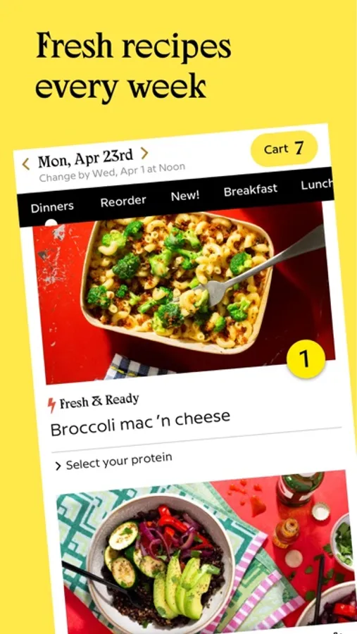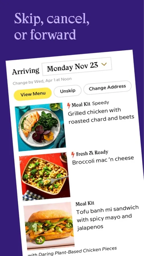 Manage your subscription anytime, anywhere. Use our app to schedule weekly deliveries, customize your menu, and discover quick and easy recipes. Need to skip, cancel, or forward your box? Sure thing.