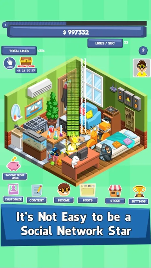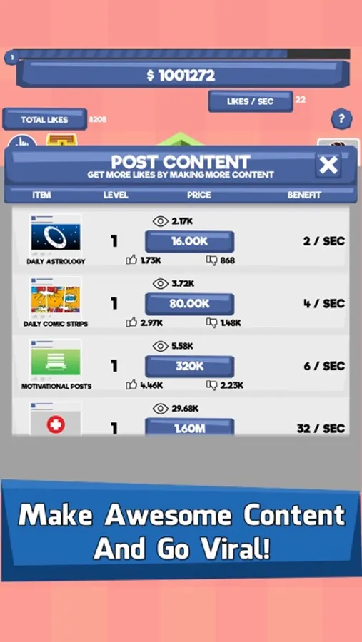 Tap to create as much new content posts as you can, which is the only best method for you to gain great popularity and money as well. Speed up the progress bar by increasing the numbers. Additionally, taking some side jobs and making upgrades to your equipments are good helpers to accelerate your popularity.