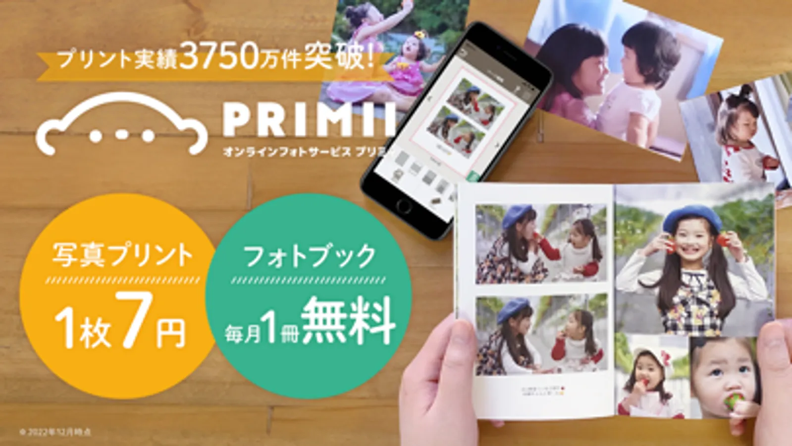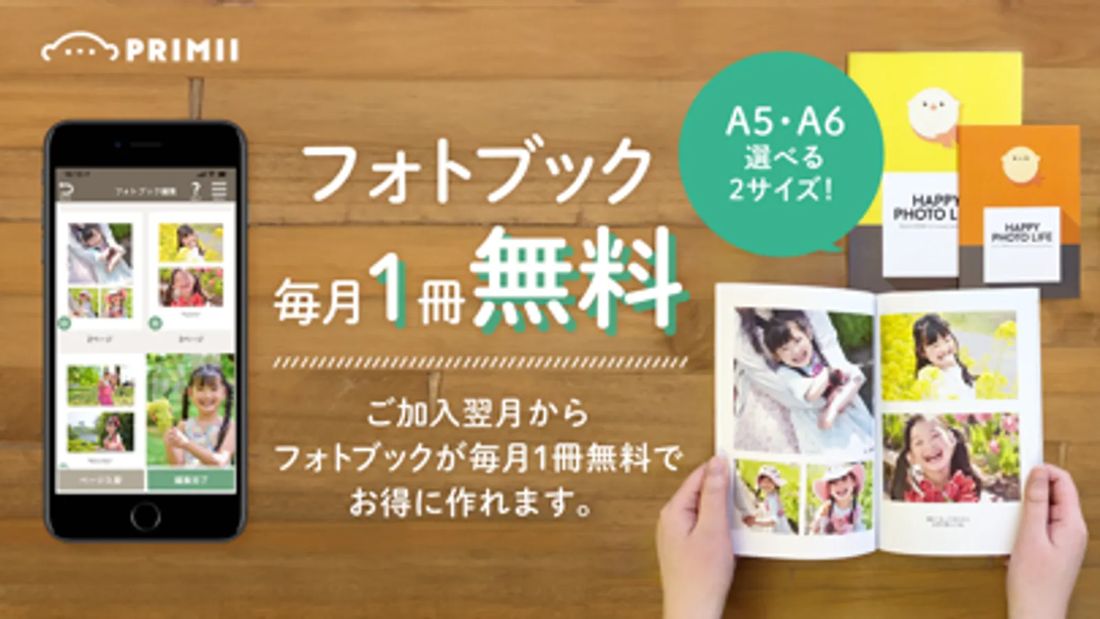 通常1冊440円(税込)のフォトブックを、PRIMII(プリミィ)ご登録翌月から、毎月1冊”無料”で作成できます!