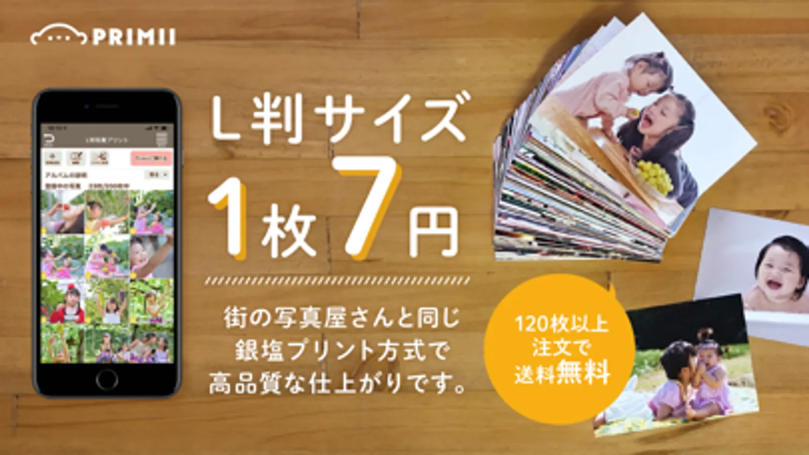 通常のL判写真プリントは、写真屋さん等だと1枚30円以上かかってしまいますが、PRIMII(プリミィ)なら1枚7円でプリントできます!