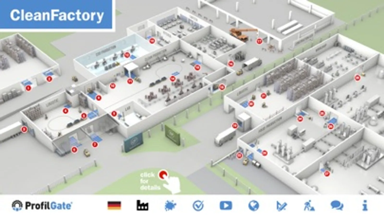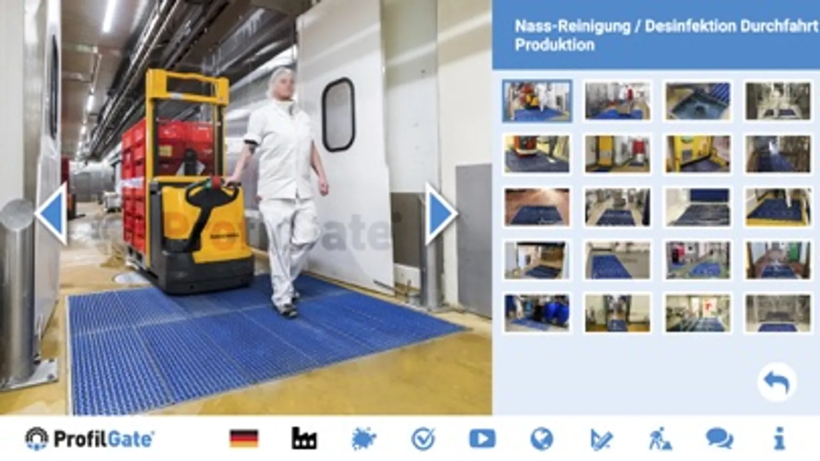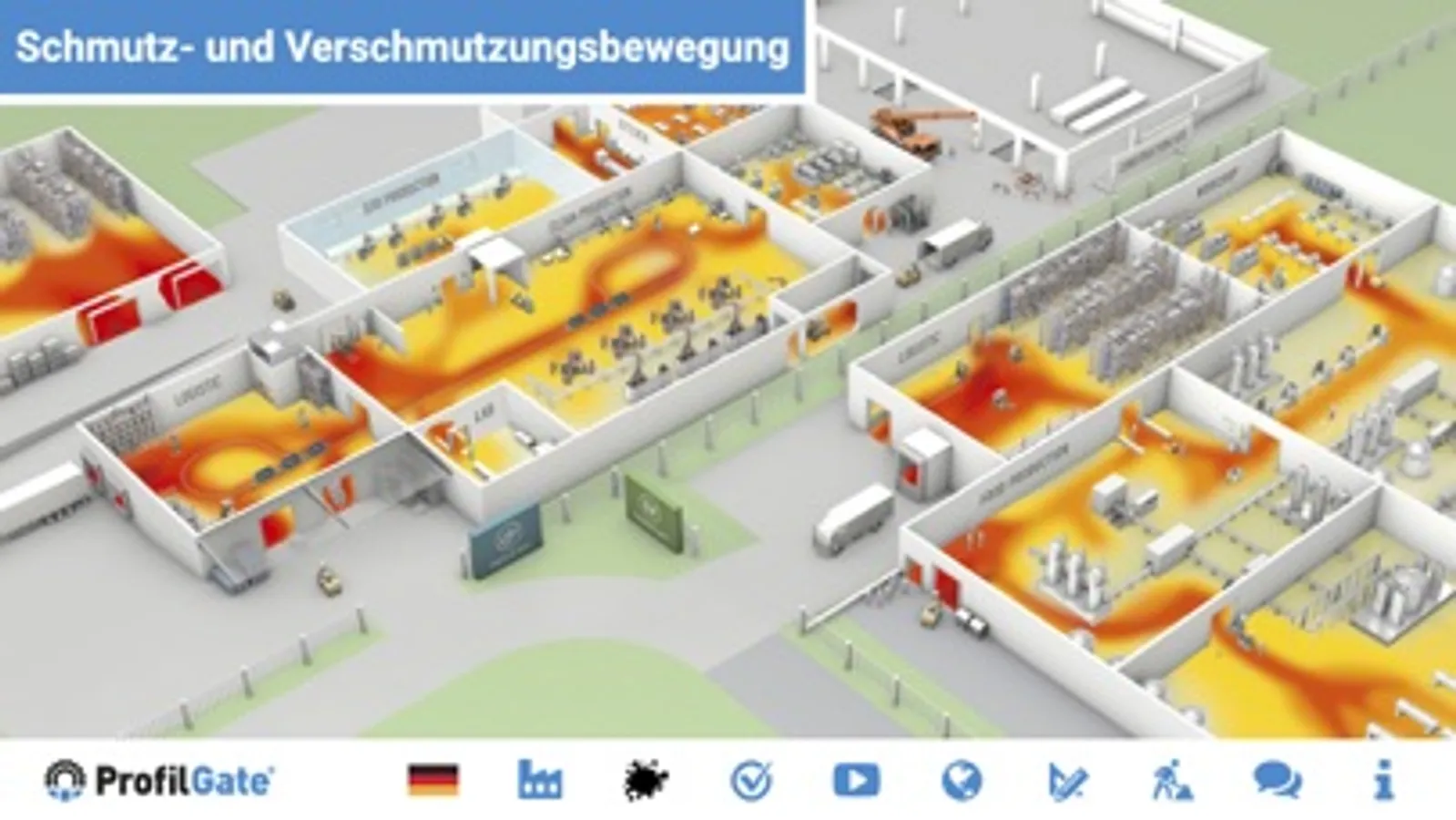 Die CleanFactory® App illustriert, wo und über welche Wege in Produktion, Montage und Logistik der meiste Schmutz über Schuhsohlen und Laufflächen von Flurförderzeugen in Fertigungsstätten gelangt – anschließend zeigt Ihnen das Konzept, wie ProfilGate® diese Verschmutzung aufhält.