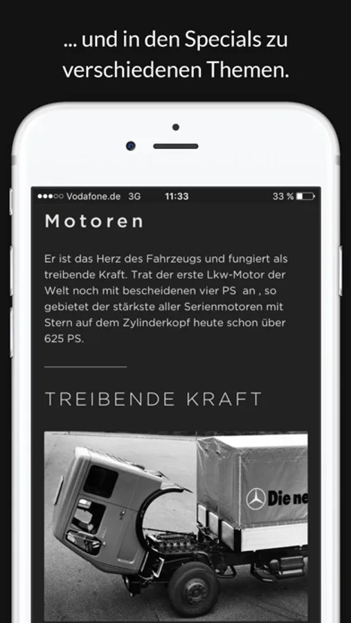 Darüber hinaus bietet dieses Museum für die Westentasche Themenspecials aus multimedial aufbereiteten Vergleichsfahrten mit Lkw aus den vergangenen Jahrzehnten. Andere Schwerpunkte widmen sich beispielsweise der Motorenentwicklung, der Sicherheit, dem Design oder der Produktion. Einen Überblick über die heute global aufgestellte Nutzfahrzeugsparte der Daimler AG gibt die interaktive Weltkarte, die Informationen zu den Hauptstandorten der Marken Mercedes-Benz, Freightliner, Westernstar, Fuso und Bharatbenz bietet.