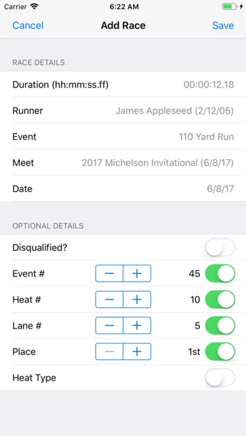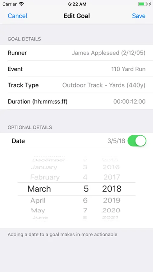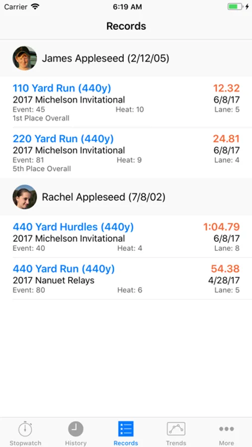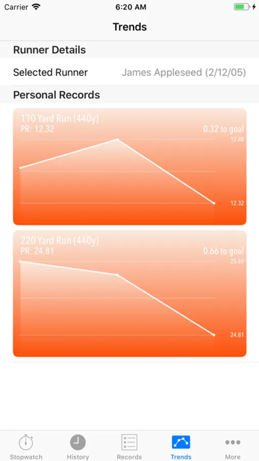 RaceKeeper Track keeps a running race history for each runner entered, a list of records by event for each runner and trends by runner and event to track performance over time. RaceKeeper also allows you to set goals.