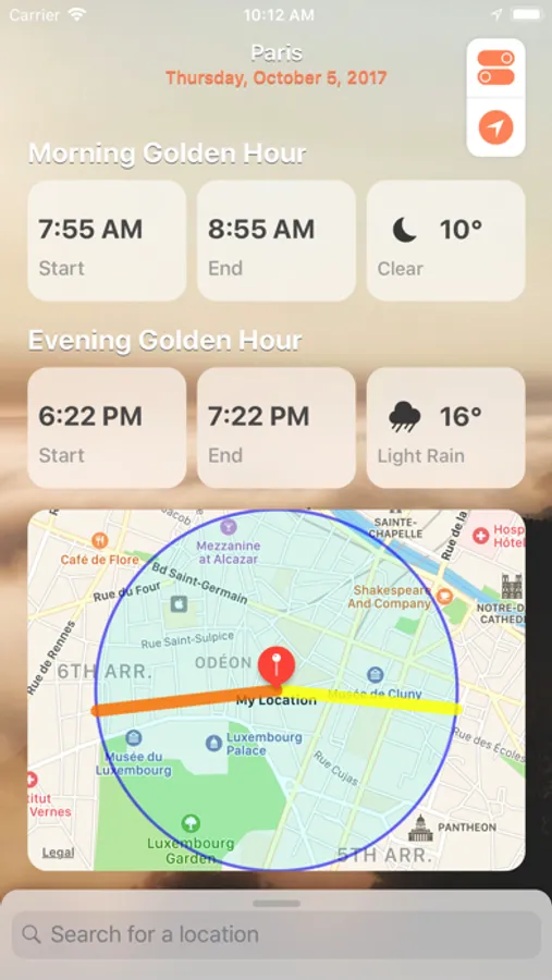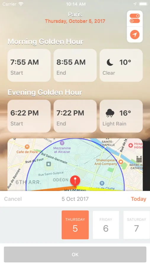 Golden Hour gives you, from the chosen location and date, the 2 best moments of the day during which you will have the most gorgeous light for you pictures.