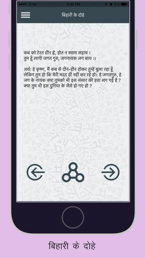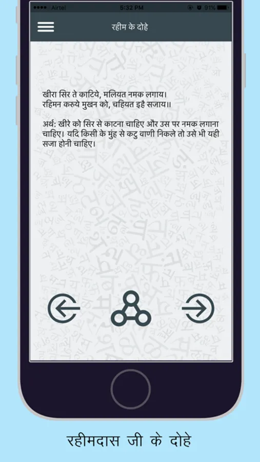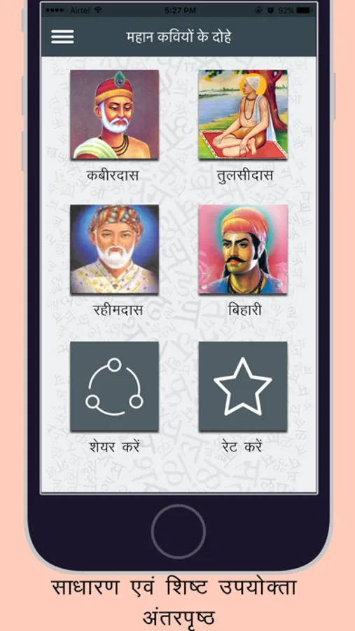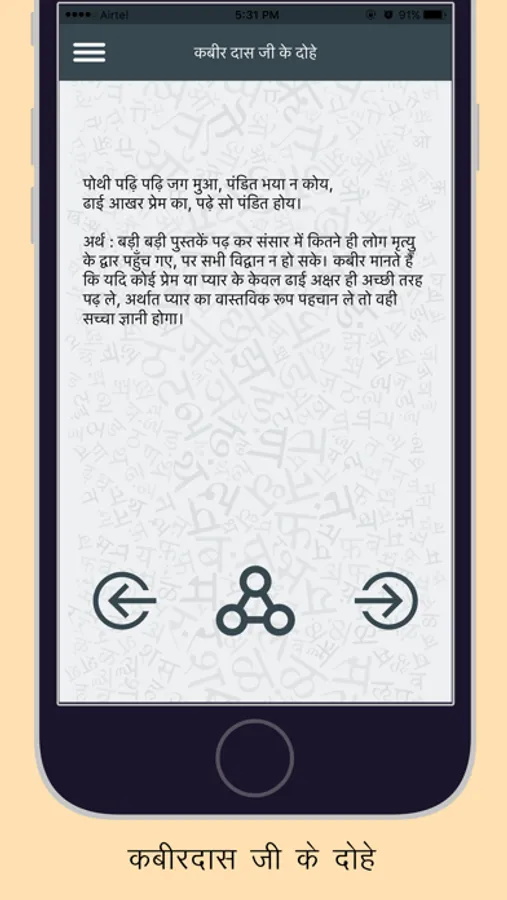 Kabir, the indian mystic poet and saint from 15th century, well known for his poetry and quotes. Kabir is one of the early poets who are the core of Indian literature in poems. We've included some of the best quotes and poetry of the famous dohas creators Kabir, Rahim, Tulsidas, and Bihari. A doha is a couplet consisting of two lines and it contains the combination of Urdu and Hindi words in a rhyming manner. This app is has a huge collection of dohas, use them to get sharper and learn in your native language.