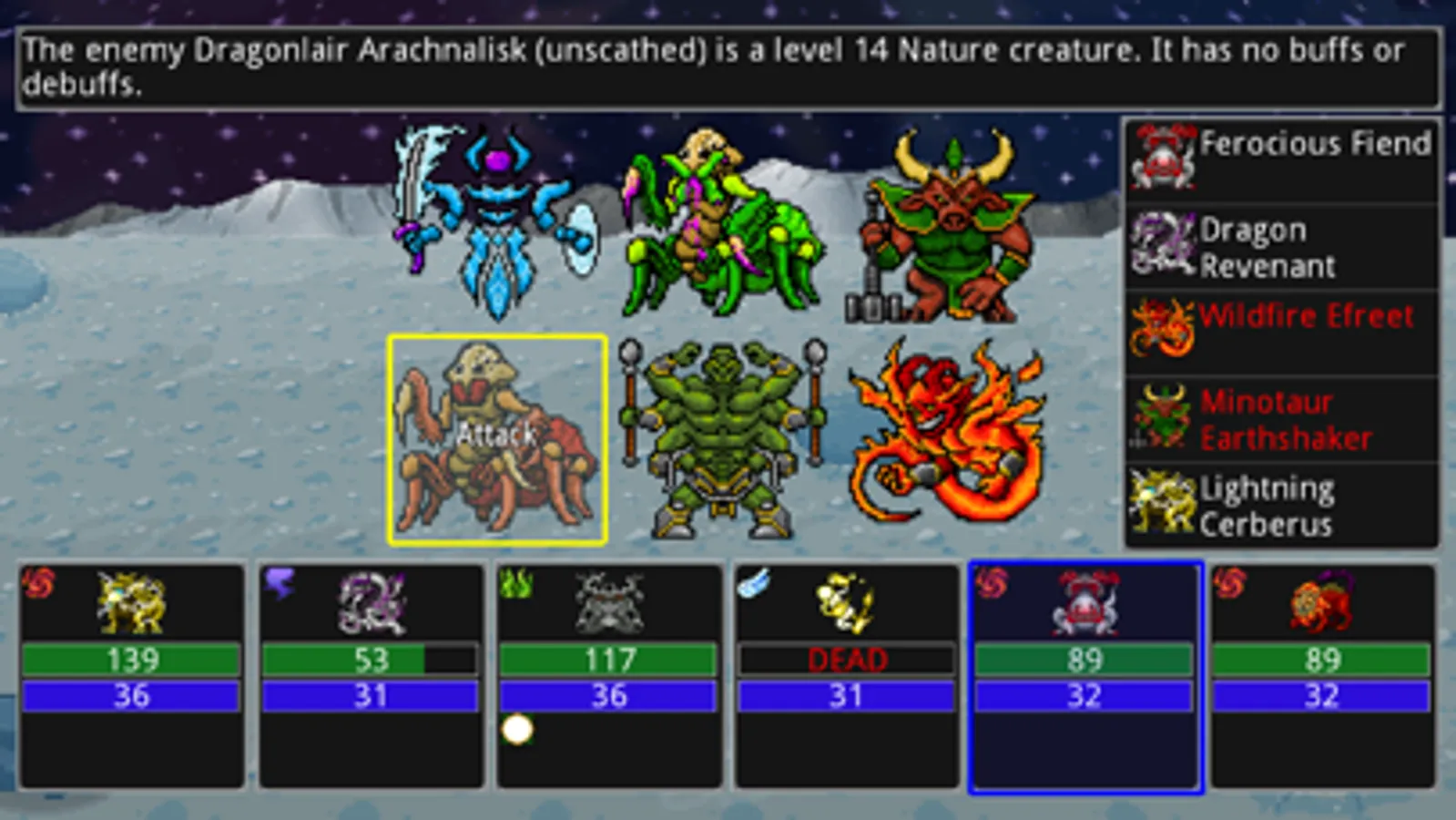 - Equip your creatures with spells. Spells can be found with randomly generated properties that change the way they behave in battle.