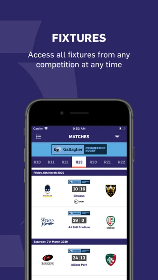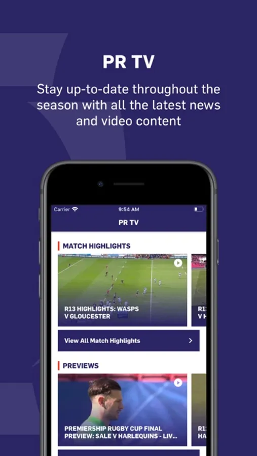 Never miss a moment from the best domestic rugby competition in the world! Watch all the latest Gallagher Premiership Rugby highlights every Monday morning. Keep up to date with lives scores every weekend, plus all fixtures, results & tables so you can follow your team across Gallagher Premiership Rugby, the Premiership Rugby Cup and European competitions. We also have the latest news, videos and exclusive content so you have everything you need to follow Premiership Rugby, all in one place.