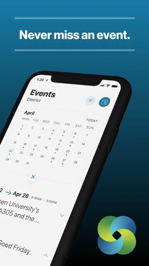 The event section shows a list of events throughout the district. Users can add an event to your calendar to share the event with friends and family with one tap.