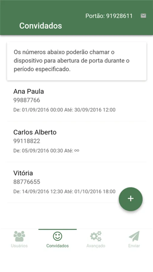Uma das principais funções do produto é a lista de convidados, nela você poderá adicionar até 20 contatos que se tornam usuários com tempo programado com a permissão para abertura da porta. Tornando simples a entrada de convidados, amigos, parentes ou empregados em eventos, festas, residências e condomínios.