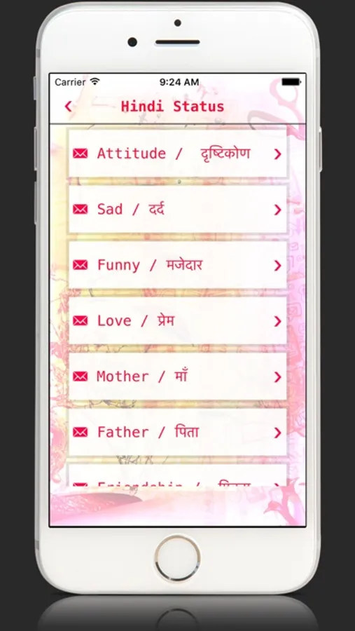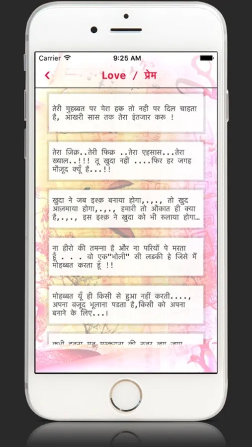 This app contain status in hindi and english languages and Shayari and Sms hindi languages.